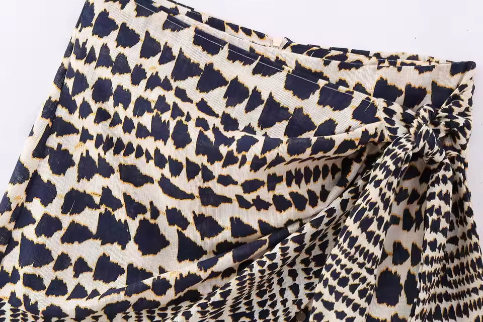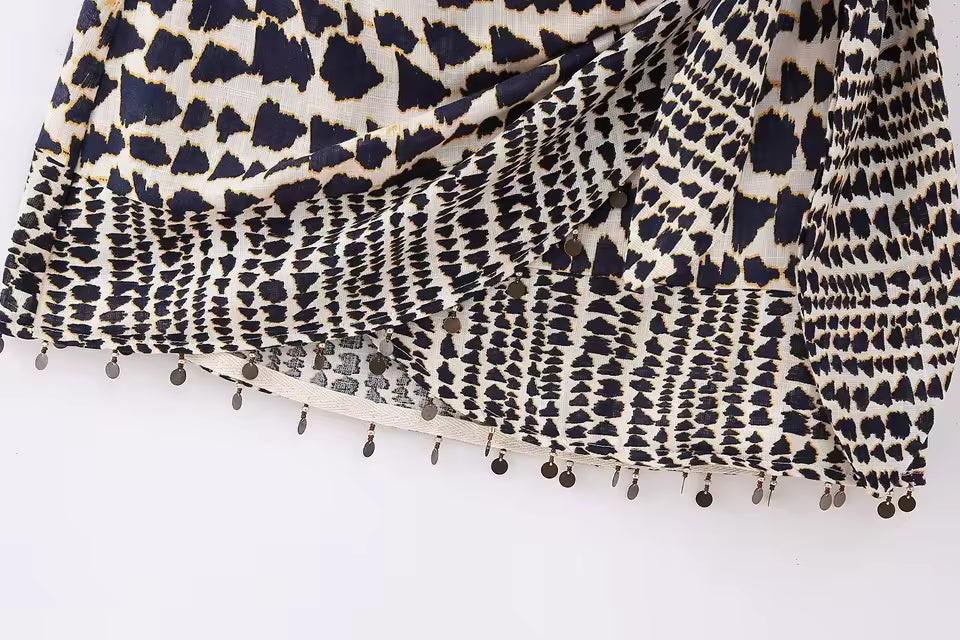 Saia mini assimétrica com estampa geométrica vintage, nó lateral e franjas delicadas.