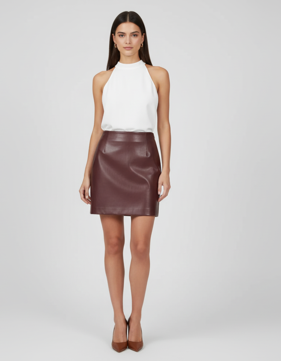 Mini saia em couro sintético marrom com design minimalista e caimento elegante.